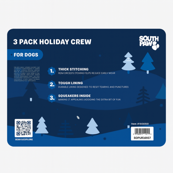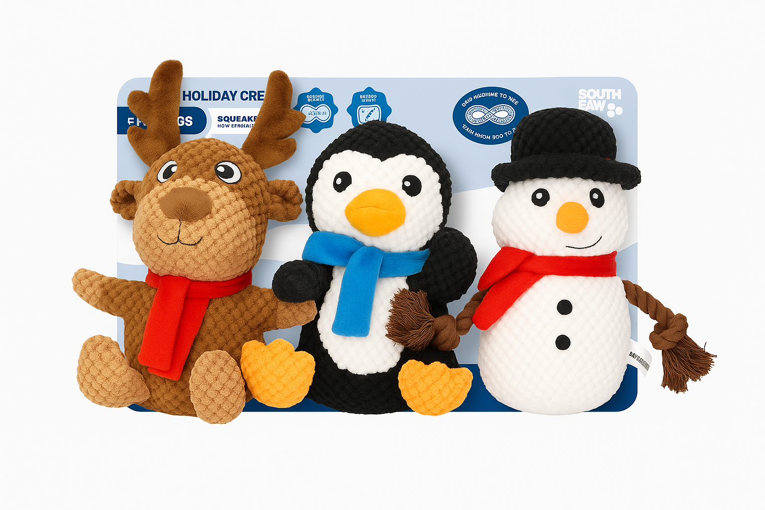 Celebrate the season with the South Paw 3-Pack Holiday Dog Toy Set, featuring a festive Snowman, Reindeer, and Penguin your pup will love! Designed for endless play, these durable Christmas dog toys combine holiday cheer with long-lasting quality.