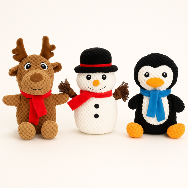 – Festive 3-pack of Winter-themed tug toys: Snowman, Reindeer, and Penguin