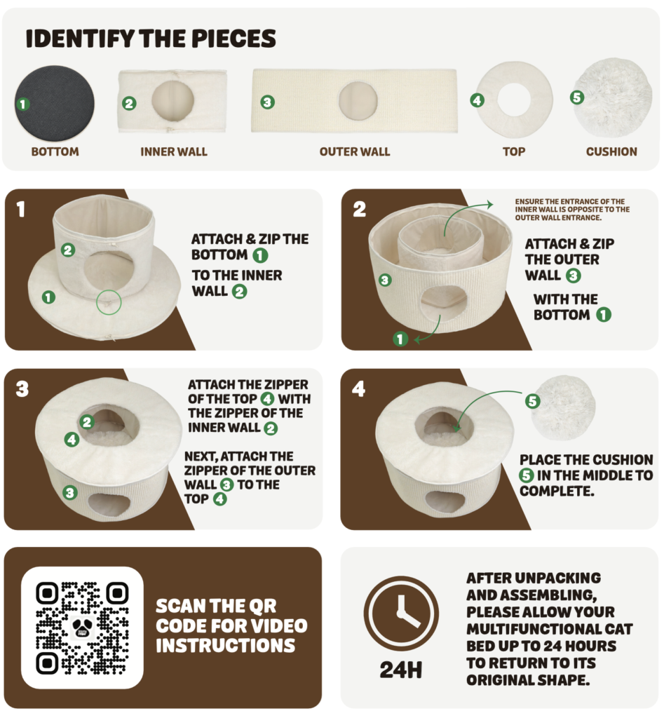 The dual-entry layout enhances airflow while allowing cats to move freely, making it ideal for curious, playful, or anxiety-prone cats. A soft center cushion adds extra comfort, while the structured walls help the bed maintain its shape once fully expanded. After unpacking and assembly, the bed naturally regains its original form within 24 hours for optimal comfort and stability.